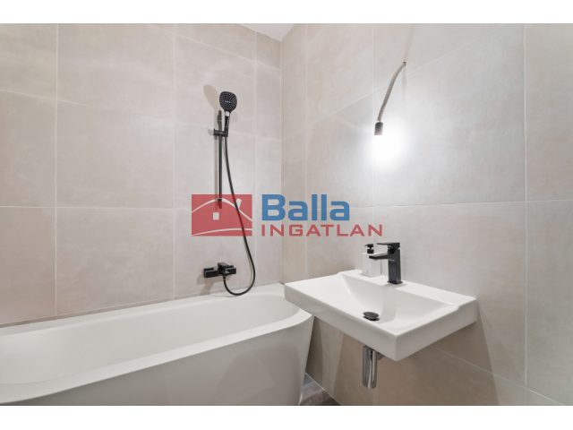 Az ingatlan 2 szobás, központi tere a rendkívül tágas, 42 m²-es nappali–konyha, amelyhez egy 2 m²-es háztartási helyiség is tartozik. A fürdőszoba elegáns kialakítású, káddal és zuhanyzóval felszerelt, a mellékhelyiség külön helyiségben található. A lakás belső tereit a padlótól plafonig érő Schüco fém nyílászárók határozzák meg, amelyek egyszerre biztosítanak bőséges természetes fényt, zavartalan panorámát és kiváló hő- és hangszigetelést.