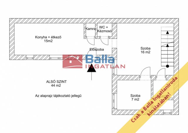 Az alsó szint 44 m2 + 16 m2 felső szinti szoba kialakítva.